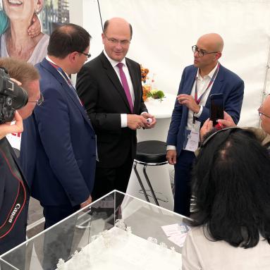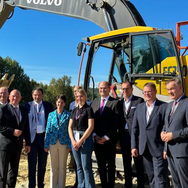 Beim offiziellen Spatenstich gaben der Bayerische Finanz- und Heimatminister Albert Füracker, Dr. Hadi Saleh, CEO der CeramTec-Gruppe, Dr. Katrin Sternberg, President Medical der CeramTec-Gruppe und Oberbürgermeister Oliver Weigel den Startschuss für den Neubau - natürlich mit Unterstützung der Agentur LederKäs.